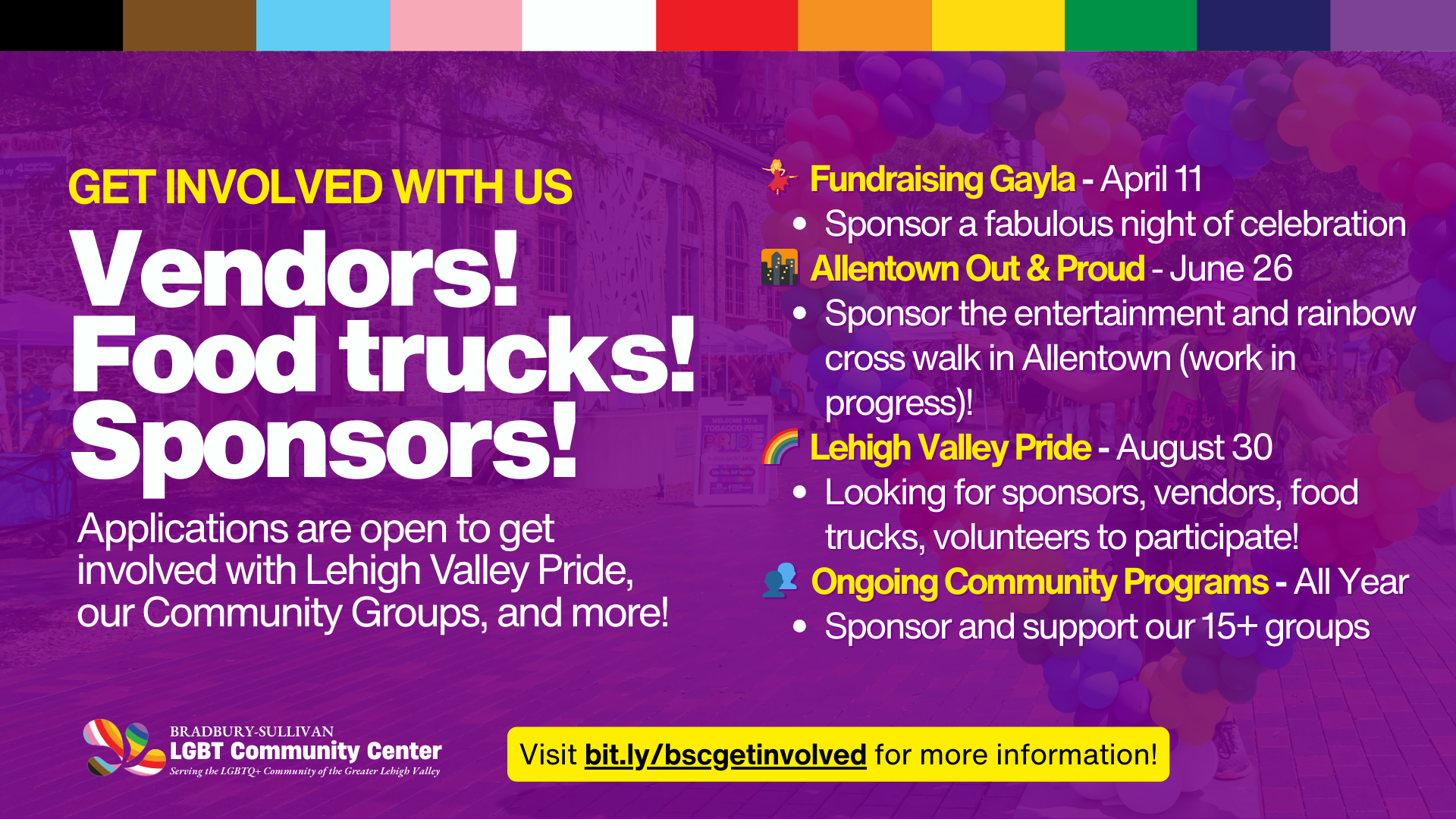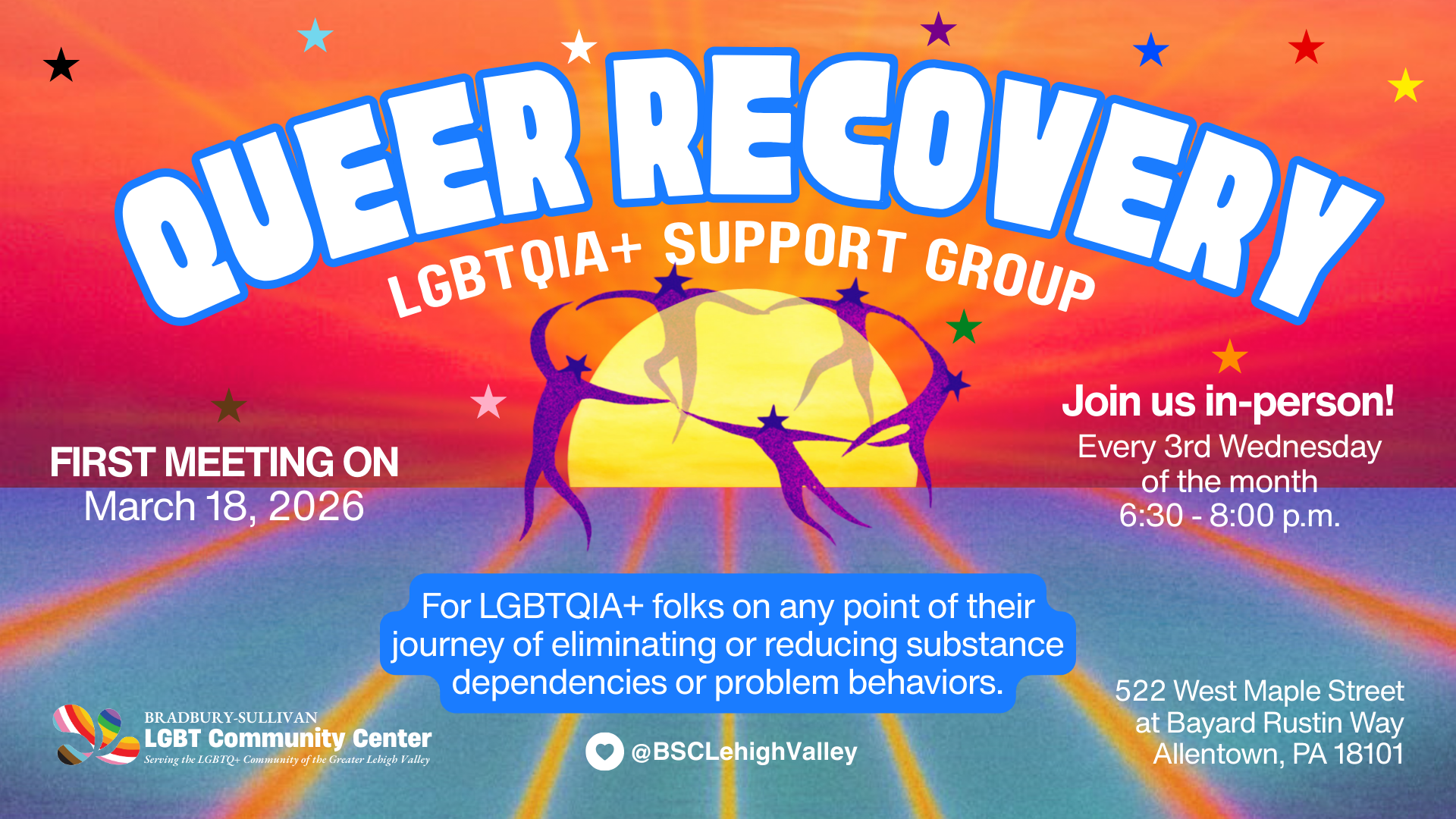 Bradbury-Sullivan LGBT Community Center provides a vibrant, inclusive space in Pennsylvania's Lehigh Valley for all of the region's LGBTQ+ residents. We produce affirming community programming, and address barriers to care through our LGBTQ+ health programs. We advocate for our community, organize our region’s annual Pride festival and we make the Lehigh Valley more equitable through our LGBTQ+ Education Institute.