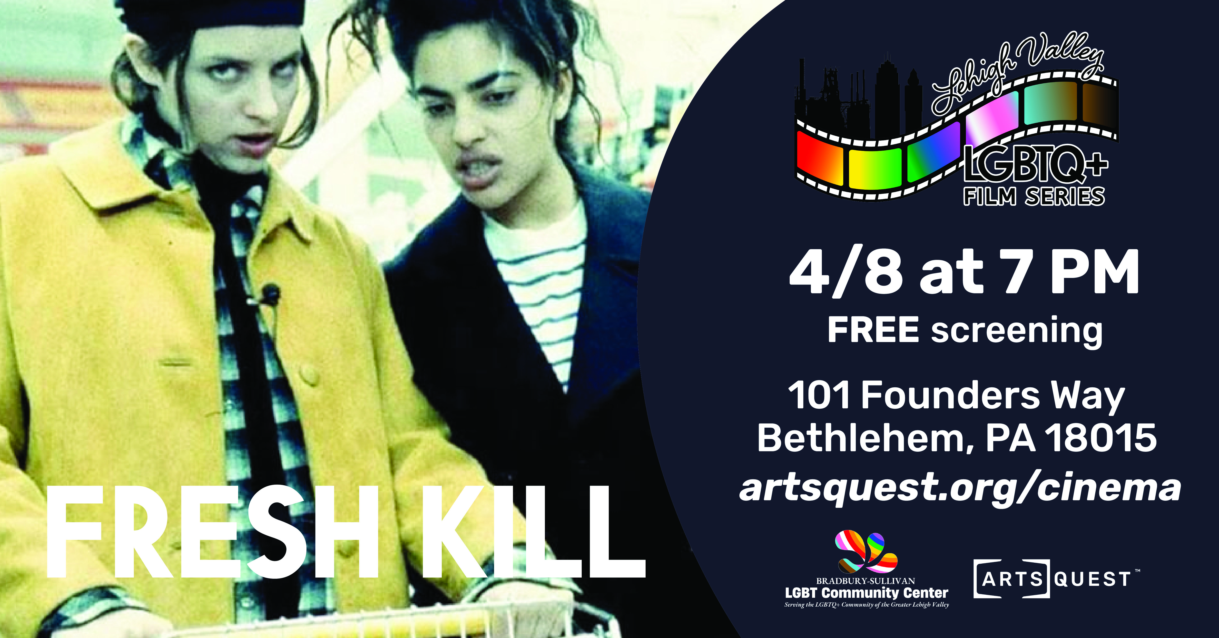 [Image description: a faded rainbow background with glints and sparkle of light. A filmstrip with Pride colors sits behind the title text and a city skyline of the Lehigh Valley. The Bradbury-Sullivan Center and ArtsQuest logo are in the bottom left]